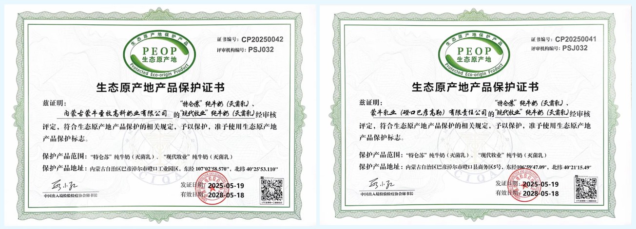 近日,CQMhjc黄金城助力内蒙古蒙牛圣牧高科奶业有限公司、蒙牛乳业(磴口巴彦高勒)有限责任公司旗下“特仑苏”纯牛奶(灭菌乳)、“现代牧业”纯牛奶(灭菌乳)顺利通过了生态原产地产品保护认证评审,成功获得生态原产地产品保护证书。